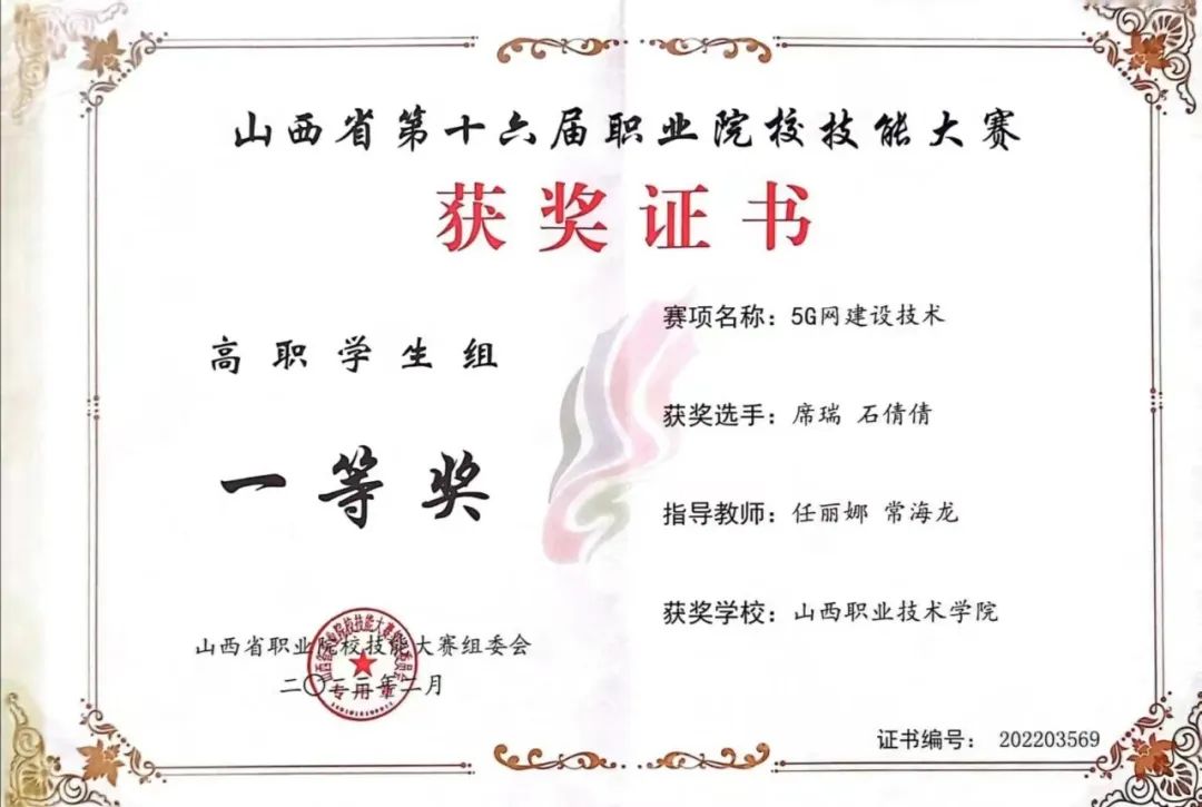电子与通信工程系党员教师张雪梅、任丽娜与中兴新思学院教师成睿睿、江旭岗、胡成海5位教师共同组成一支教师指导团队,历经6个月对学生的专业指导和培训,备赛期间按照参加世赛国赛的标准严格要求学生。2023年2月25日,带领6名同学前往山西机电职业技术学院参加“中银杯”山西省第十六届职业院校高职技能大赛——高职组5G全网建设技术赛项。最经过6个小时比赛,最终获得了一等奖的优异成绩。