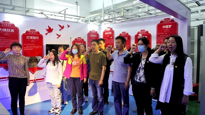 参观体验结束后,全体党员在鲜红的党旗前重温入党誓词,进一步感悟思想伟力,不忘初心使命。