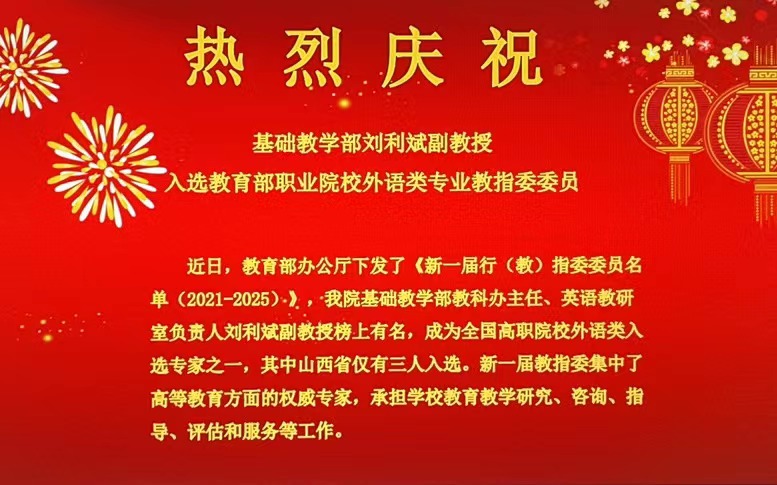 基础教学部刘利斌副教授入选教育部职业院校外语类专业教指委委员