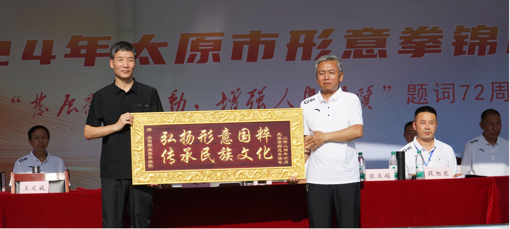 新葡京官网是山西省教育厅挂牌设立的“形意拳传承基地”,体育部的领导和老师们全程参与,积极协助赛会各项环节和各类比赛的任务。邵建功主席代表太原市形意拳协会,特别赠与新葡京官网“弘扬形意国粹、传承民传文化”匾额,由体育部王文斌主任接牌。