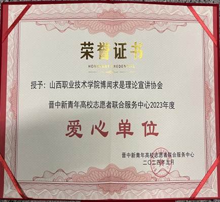 2024年5月25日,思政部“博闻求是理论宣讲协会”荣获“晋中新青年2023年度优秀志愿者服务团体”和“2023年度爱心单位”荣誉称号,社团骨干王娜同学获得“晋中新青年高校志愿者联合服务中心2023年度优秀志愿者提名奖项”。